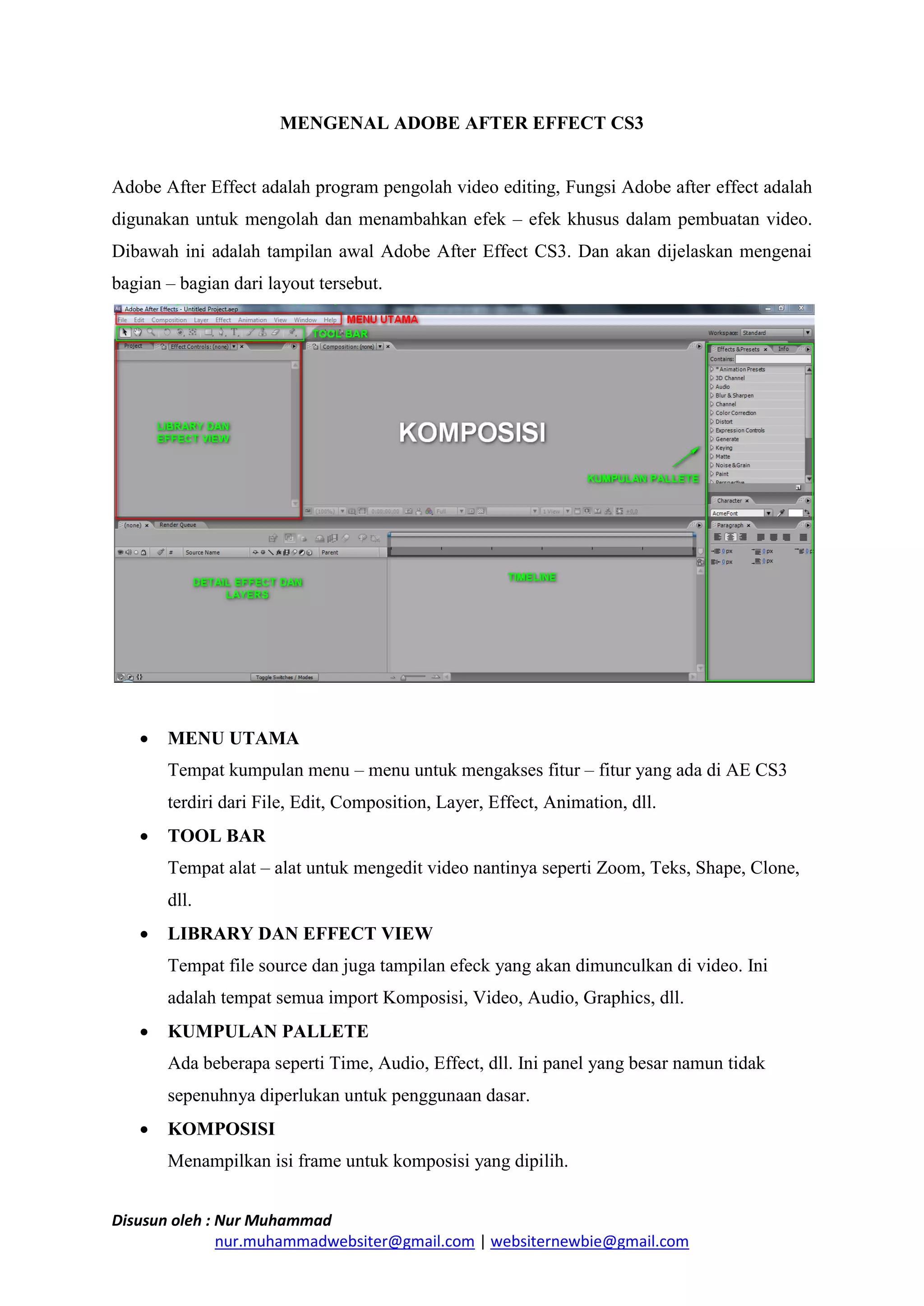Dokumen tersebut memberikan penjelasan singkat tentang Adobe After Effects CS3. Dokumen tersebut menjelaskan fungsi-fungsi dasar After Effects seperti layout antarmuka, panel-panel utama, serta alat-alat dasar untuk mengedit video seperti penambahan efek khusus dan animasi.