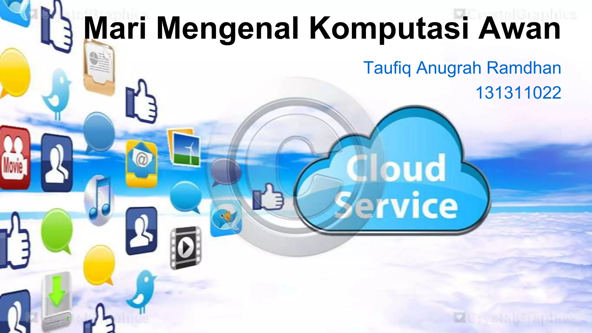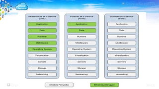 Dokumen tersebut membahas mengenai komputasi awan, yaitu teknologi yang memungkinkan pengguna mengakses dan menyimpan data secara online melalui server. Terdapat tiga jenis layanan komputasi awan yaitu IaaS, PaaS, dan SaaS. Komputasi awan memiliki berbagai manfaat untuk pendidikan, bisnis, masyarakat, dan pemerintah seperti mengurangi biaya dan memungkinkan akses di mana saja.
