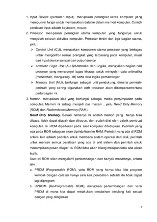 Dokumen ini menjelaskan konsep dasar komputer, termasuk komponen utama seperti hardware, software, dan brainware, serta bagaimana mereka berinteraksi dalam sistem komputer. Selain itu, dokumen ini mengkategorikan jenis-jenis komputer dan perkembangan sejarah komputer dari generasi pertama hingga kedua. Terdapat penjelasan mendetail mengenai memori, prosesor, dan sistem operasi yang penting dalam pemrosesan data.