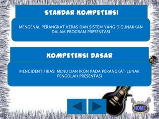 Dokumen tersebut berisi materi pelajaran Teknologi Informasi dan Komunikasi untuk kelas IX semester 1 tentang pengenalan perangkat keras dan sistem yang digunakan dalam program presentasi khususnya Microsoft PowerPoint 2007. Materi ini mencakup penjelasan tentang cara mengaktifkan, mengenal fitur-fitur, dan contoh penggunaan PowerPoint 2007.