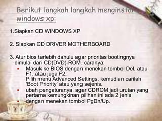 Ringkasan dari dokumen tersebut adalah langkah-langkah untuk menginstal Windows XP dan aplikasi Microsoft Office 2007 pada komputer, meliputi persiapan CD instalasi, pengaturan BIOS, proses instalasi sistem operasi dan driver, serta aktivasi aplikasi.