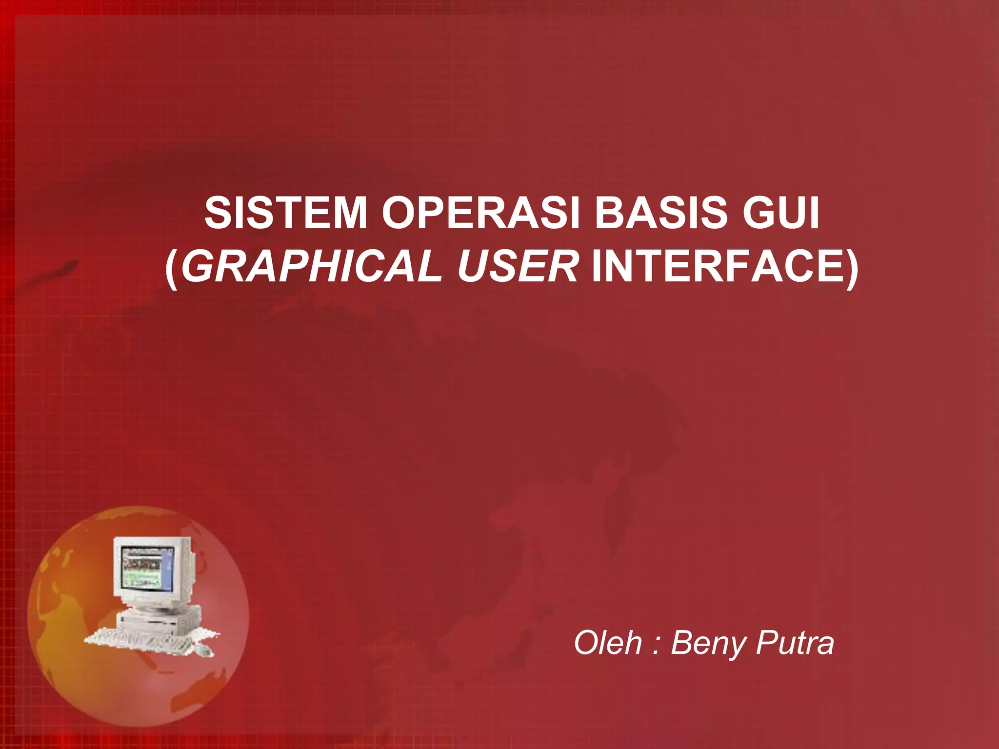 Dokumen ini menjelaskan tentang sistem operasi berbasis GUI (Graphical User Interface) seperti Windows, Macintosh, dan Linux, serta menjelaskan fungsionalitas pointing devices seperti mouse dan cara penggunaannya. Selain itu, dijelaskan juga tentang pengelolaan folder, termasuk membuat, menghapus, dan mengganti nama folder di Windows. Pemahaman mengenai antarmuka grafis dan penggunaan mouse sangat penting dalam mengoperasikan sistem komputer.