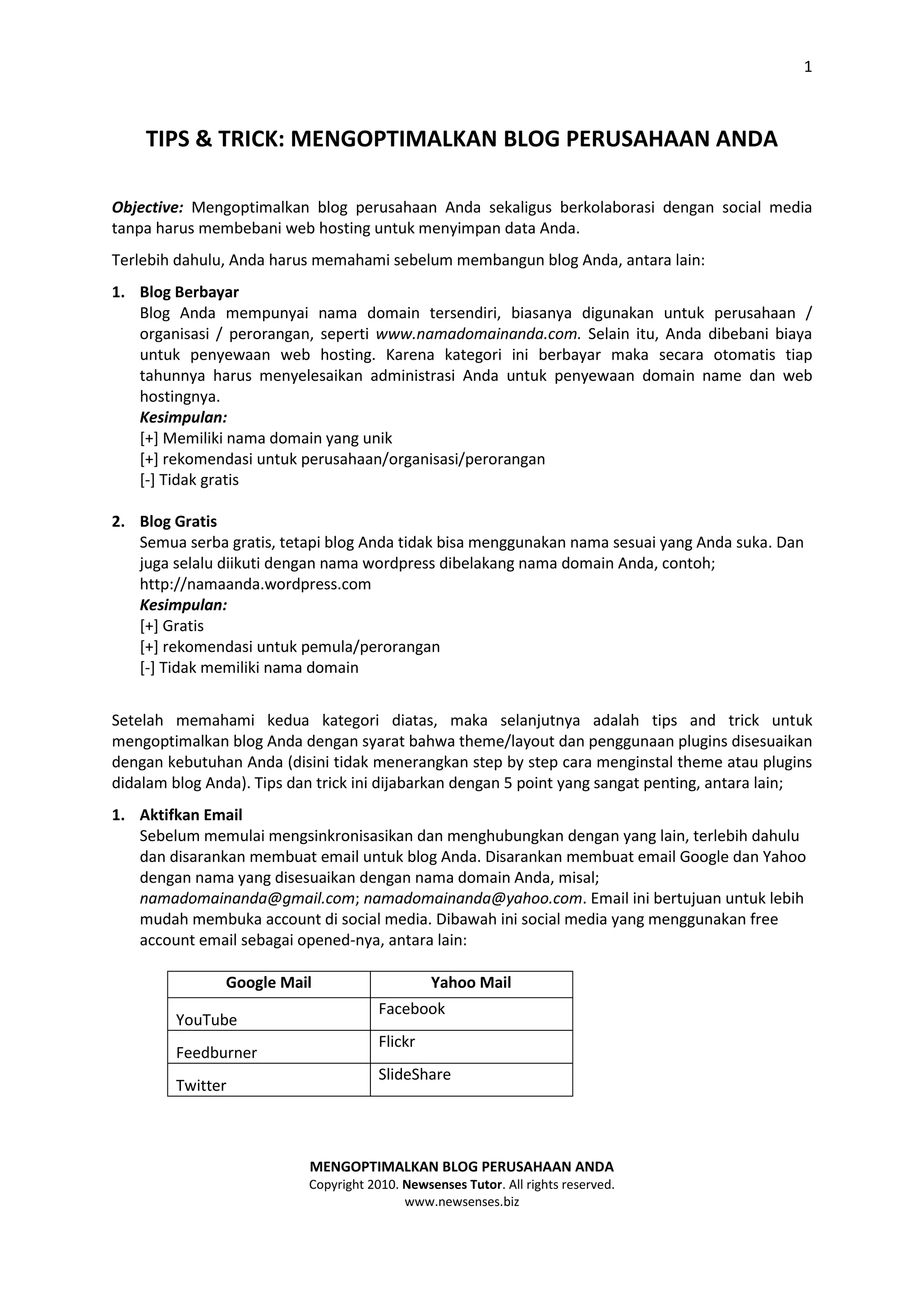 Dokumen ini memberikan tips untuk mengoptimalkan blog perusahaan dengan mengintegrasikannya dengan media sosial seperti YouTube, Flickr, SlideShare tanpa harus menyimpan konten di hosting sendiri. Hal ini dilakukan dengan membuat akun email dan sosial media, lalu menghubungkan blog dengan akun-akun tersebut dan hanya menyisipkan tautan ke konten yang diunggah ke platform lain. Dokumen ini juga menjelaskan cara menginstal plugin-plugin untuk m