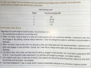 Meniere's disease is a disorder of the inner ear that causes episodes of vertigo accompanied by ringing in the ears and hearing loss. It is caused by endolymphatic hydrops, or a buildup of fluid in the inner ear. The classic symptoms are vertigo, hearing loss, tinnitus, and a feeling of fullness in the ear. Diagnosis involves ruling out other causes and demonstrating these characteristic symptoms. Treatment ranges from lifestyle changes and medication to more invasive procedures like injections of gentamicin if conservative measures fail.