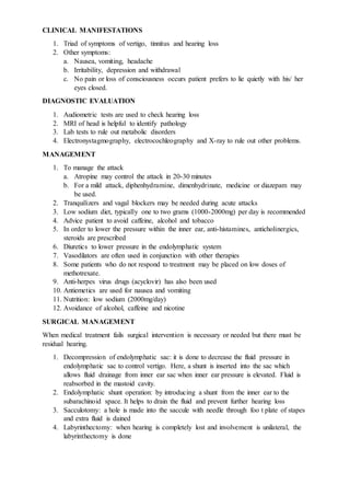 Meniere's disease is a disorder of the inner ear characterized by vertigo, hearing loss, and tinnitus. The cause is unknown but may involve fluid imbalance in the inner ear. Risk factors include middle ear infections, head trauma, upper respiratory infections, smoking, alcohol, and high salt diet. Symptoms include vertigo, nausea, vomiting, and hearing loss. Diagnosis involves audiometric tests, MRI, and lab tests. Treatment focuses on managing vertigo attacks, a low sodium diet, medications to lower inner ear pressure like diuretics and steroids, and sometimes surgery if medications fail. Nursing care includes bed rest, reassurance, a safe environment, low salt diet, and avoiding activities requiring balance
