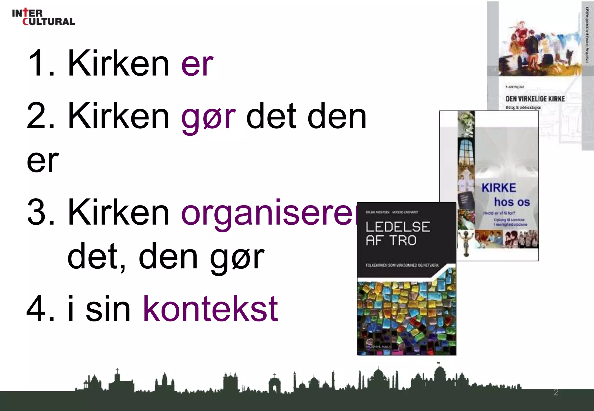 1. Kirken er2.Kirken gør det den er3. Kirken organiserer det, den gør4. i sin kontekst34