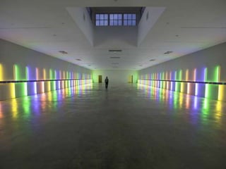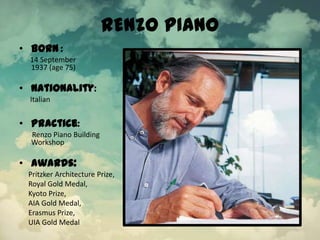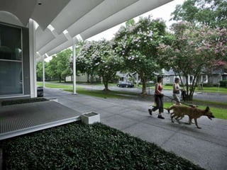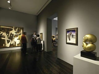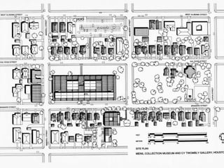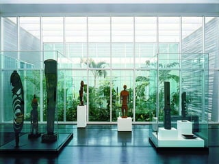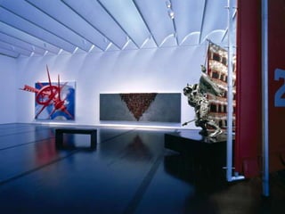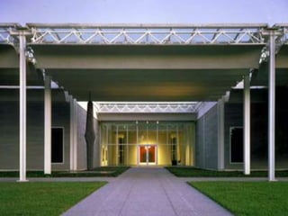 The Menil Collection in Houston, Texas houses the private art collection of John de Menil and Dominique de Menil. Renzo Piano designed the museum building in 1987 to hold the collection of over 15,000 works of twentieth-century art. Piano's understated design blends into the surrounding residential neighborhood with a facade of gray siding and steel. The museum allows natural light into galleries while protecting works of art, using a wave-shaped roof and ceiling structure inspired by sailboats. The campus has expanded over time and the neighborhood maintains a coordinated aesthetic.
