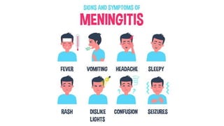 The document outlines the different types of meningitis, including pyogenic and aseptic forms, and categorizes bacterial causes by age groups. It also discusses laboratory investigations, empirical treatment options, and prophylaxis measures for various types of bacteria, including meningococcal and Haemophilus infections. Additionally, it highlights the importance of vaccination in preventing these conditions.
