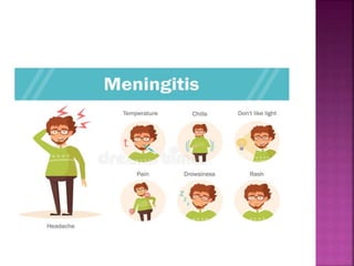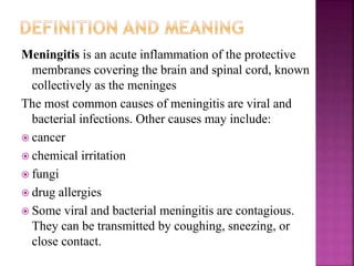 Meningitis is an inflammation of the meninges that covers the brain and spinal cord. It is usually caused by viral or bacterial infections, though fungi, drugs, and cancer can also cause meningitis. Symptoms include fever, headache, nausea, and neck stiffness. Diagnosis involves spinal fluid analysis, imaging, and culture tests. Treatment focuses on antibiotics, antivirals, or antifungals depending on cause, with supportive care like IV fluids and fever control. Complications can be serious if untreated and include long term neurological deficits.
