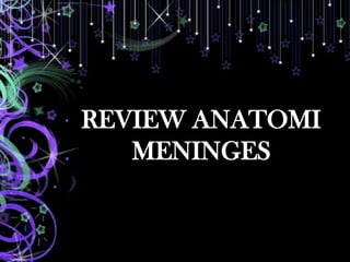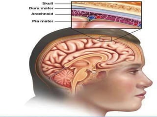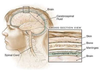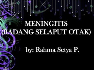 Meningitis adalah peradangan selaput otak yang disebabkan oleh bakteri, virus, jamur, atau protozoa, dengan manifestasi klinis termasuk nyeri kepala, demam, dan kekakuan leher. Diagnosis dilakukan melalui pemeriksaan cairan serebrospinal dan budaya mikroba. Komplikasi dapat mencakup peningkatan tekanan, encephalitis, dan kerusakan saraf.