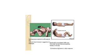 - Symptoms can include fever, headache, nausea, and signs of meningeal irritation like neck stiffness. Diagnosis involves CSF and blood tests. Treatment depends on the suspected cause but may include