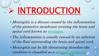 Meningitis is an inflammation of the protective membranes (meninges) surrounding the brain and spinal cord. It is usually caused by a viral or bacterial infection. The meninges have three layers (dura mater, arachnoid mater, and pia mater) that are separated by fluid-filled spaces. Meningitis is a medical emergency because it can be life-threatening. It most commonly affects children and young adults. Bacterial meningitis is usually preceded by a mild respiratory infection that allows bacteria to enter the bloodstream and meninges. Diagnosis involves examination of cerebrospinal fluid obtained via lumbar puncture for signs of infection.
