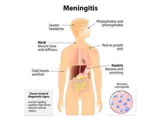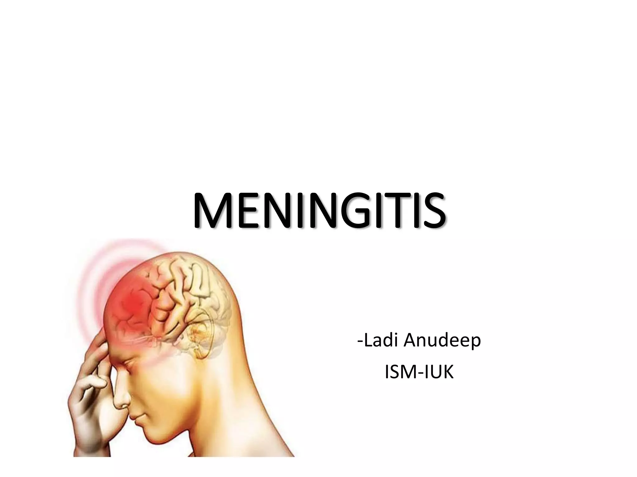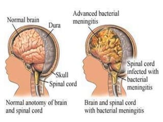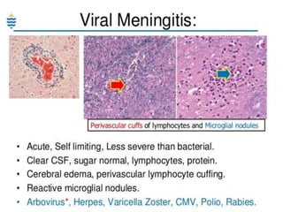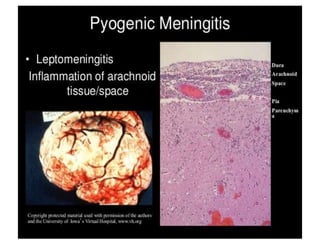 This document discusses different types of meningitis, including acute pyogenic meningitis, acute lymphocytic meningitis, and chronic meningitis. Acute pyogenic meningitis is caused by bacteria and results in inflammation of the meninges around the brain. Common causative organisms vary with age. Acute lymphocytic meningitis is usually viral and has milder symptoms that resolve more quickly. Chronic meningitis includes tuberculous and cryptococcal types, which cause long-term granulomatous inflammation that may lead to hydrocephalus. Diagnosis is based on examination of cerebrospinal fluid characteristics.