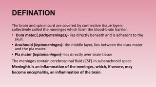 Meningitis is an inflammation of the meninges, which are the protective membranes that cover the brain and spinal cord. Bacteria can reach the meninges through the bloodstream, direct contact from a site of infection like the sinuses or ears, or iatrogenically through procedures like lumbar puncture. Symptoms include fever, headache, neck stiffness, and altered mental status. Diagnosis involves analyzing cerebrospinal fluid obtained via lumbar puncture for signs of infection like increased white blood cells. The most common causes of bacterial meningitis are Streptococcus pneumoniae, Neisseria meningitidis, and Haemophilus influenzae.