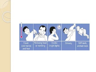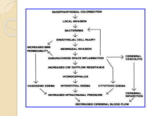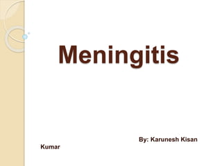 Meningitis is an inflammation of the protective membranes covering the brain and spinal cord, primarily caused by viral or bacterial infections. Bacterial meningitis is severe and can lead to significant complications, with common pathogens including Neisseria meningitidis and Streptococcus pneumoniae. Diagnosis typically involves CSF analysis and blood cultures, while prevention includes vaccinations and antibiotic prophylaxis.