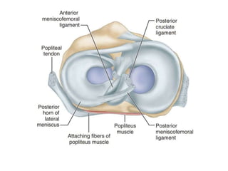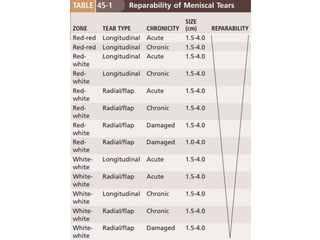 The meniscus has a crescent shape and acts as a shock absorber in the knee. It develops fully by 10 weeks of gestation. The meniscus has radial, circumferential, and perforating fibers that allow it to bear loads and stabilize the knee joint. Meniscal tears most commonly occur in the posterior horn from rotational forces on a flexed knee. Tears are classified as longitudinal, horizontal, oblique, radial, or displaced. Clinical exams like McMurray's test and MRI are used to diagnose tears, which are often treated surgically with repair, partial/subtotal/total meniscectomy. Untreated tears can lead to meniscal cysts or discoid meniscus formation over time