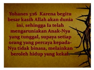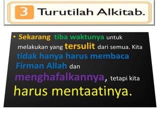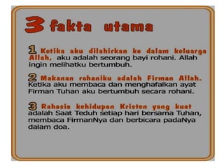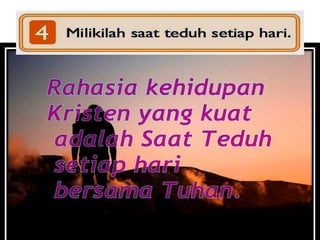 Dokumen tersebut membahas tentang pentingnya memiliki hubungan yang kuat dengan Tuhan melalui Roh Kudus dan membaca Alkitab secara teratur. Dianjurkan untuk memiliki waktu khusus bersama Tuhan setiap hari untuk belajar dan bertumbuh secara rohani.