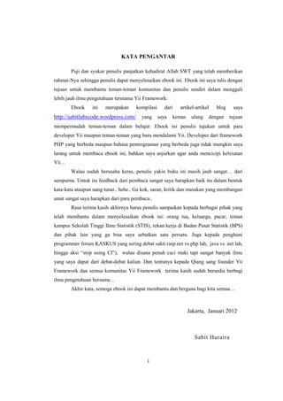 Ebook ini ditujukan untuk membantu pembaca, terutama developer, dalam memahami dan menggunakan Yii Framework untuk membangun aplikasi web. Konten ebook mencakup pengenalan Yii, konsep model-view-controller, serta panduan praktis dalam membuat aplikasi forum. Penulis berharap ebook ini memberikan fondasi yang memadai bagi pembaca yang memiliki pengetahuan dasar tentang pemrograman PHP dan database.