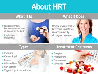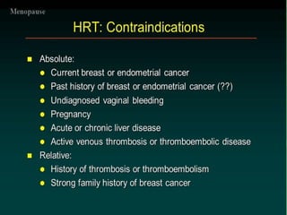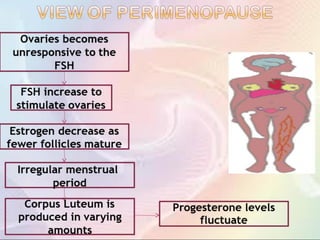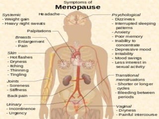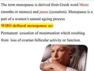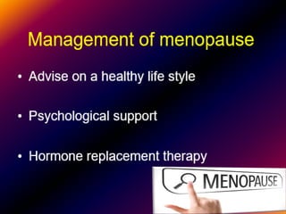 The document provides a comprehensive overview of menopause, highlighting its definition, physiological changes, symptoms, and management strategies. It discusses the hormonal, psychological, and physical impacts of menopause on women's health, including risks such as osteoporosis and heart disease, along with tips for lifestyle modifications and hormonal treatment options. Additionally, it outlines the role of healthcare providers in supporting women through menopause, emphasizing personalized approaches to care.
