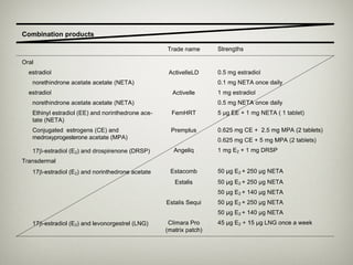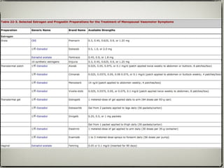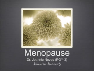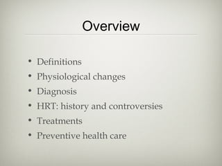 This document provides an overview of menopause, including definitions, physiological changes, diagnosis, and treatments. It discusses the average age of menopause and influential factors. It defines menopause, premature ovarian failure, and the menopausal transition period. It then covers changes to the hypothalamus-pituitary-ovarian axis, ovaries, endometrium, central thermoregulation, and other areas. It provides details on evaluating abnormal uterine bleeding and discusses treatment options like hormone replacement therapy, antidepressants, clonidine, gabapentin, and complementary therapies.