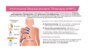 This document discusses menopause and hormone replacement therapy (HRT). It defines menopause and the stages surrounding it. It describes the endocrine changes that occur and various symptoms women may experience physically, psychologically, and with their sexual/reproductive systems. The document also outlines the risks and benefits of HRT, how it is administered, contraindications, and potential side effects.