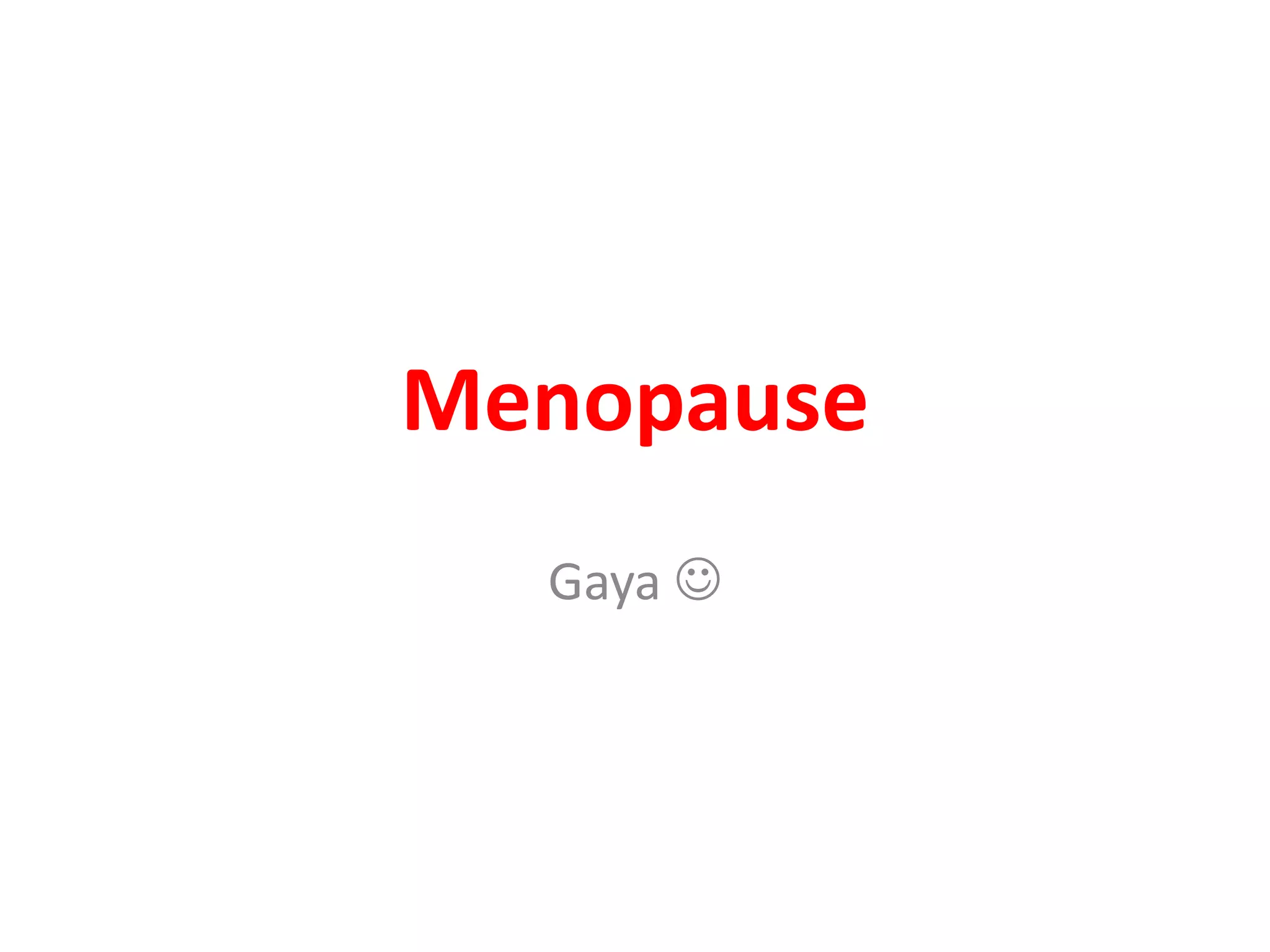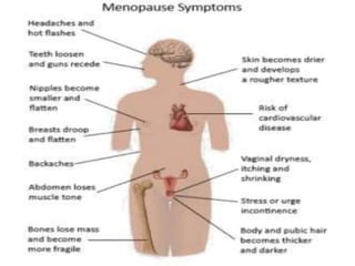 Menopause typically occurs between ages 50-52 as ovaries stop producing eggs and estrogen levels decline. Symptoms include hot flashes, night sweats, and vaginal dryness. Management includes lifestyle changes and various hormonal and non-hormonal treatments to relieve symptoms and prevent long-term issues like osteoporosis and heart disease. Hormone replacement therapy (HRT) effectively treats short-term menopausal issues but carries risks if used long-term like an increased risk of breast cancer. Careful screening and use of the lowest effective dose for the shortest time is recommended for HRT.
