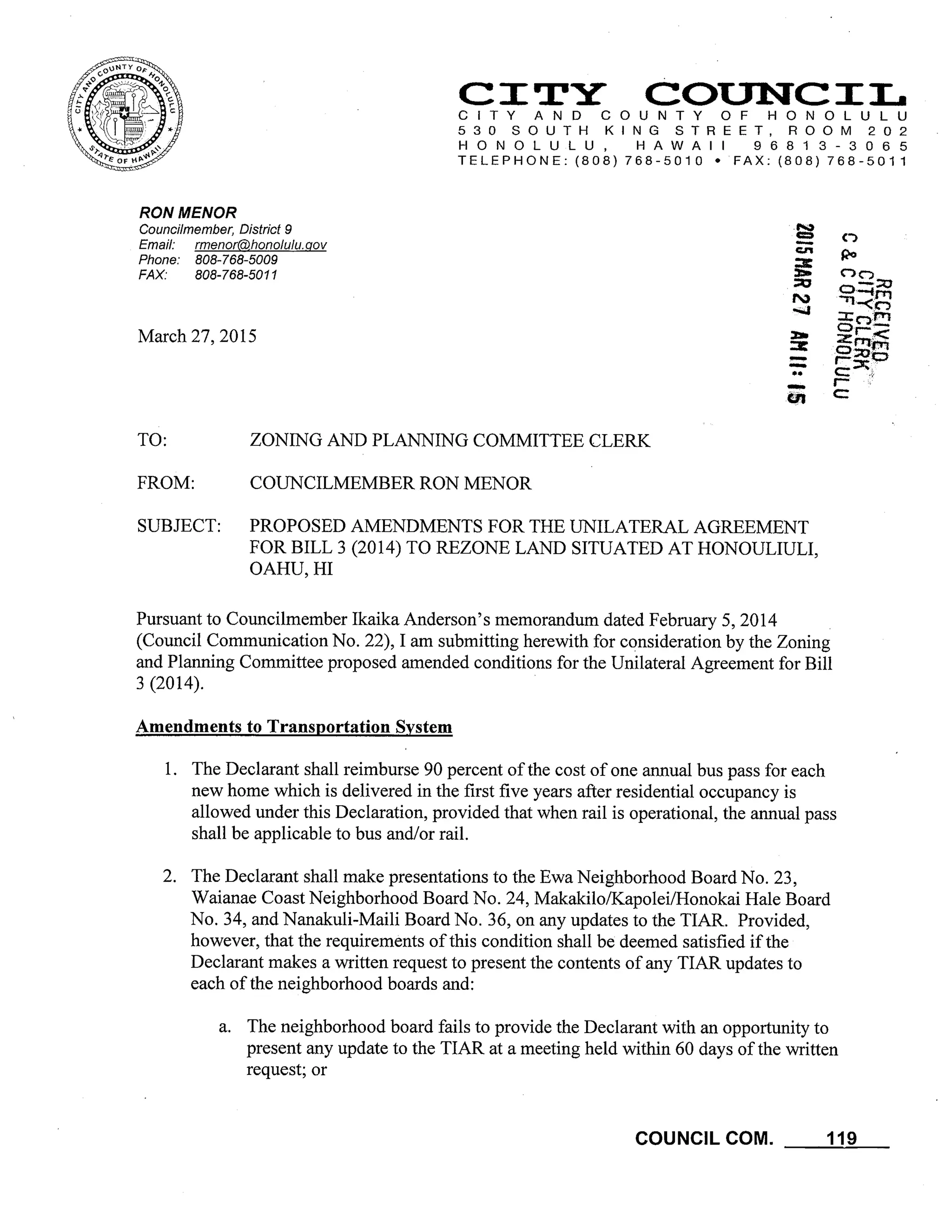 This document is a letter from Councilmember Ron Menor to the Zoning and Planning Committee Clerk proposing amendments to the unilateral agreement for Bill 3 2014. The proposed amendments relate to transportation system requirements and affordable housing requirements for a development project in Honouliuli, Oahu. For transportation, the amendments include provisions for bus pass reimbursement, neighborhood board presentations on traffic studies, and road/traffic mitigation measures. For affordable housing, the amendments propose minimum percentages of affordable rental and for-sale units in on-site and off-site development, as well as an alternative in-lieu fee option.