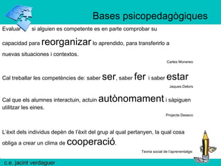 Bases psicopedagògiques Evaluar si alguien es competente es en parte comprobar su capacidad para reorganizar lo aprendido, para transferirlo a nuevas situaciones i contextos. Carles Monereo Cal treballar les competències de: saber ser , saber fer i saber estar Jaques Delors Cal que els alumnes interactuin, actuin autònomament i sàpiguen utilitzar les eines. Projecte Deseco L’èxit dels individus depèn de l’èxit del grup al qual pertanyen, la qual cosa obliga a crear un clima de cooperació . Teoria social de l’aprenentatge: