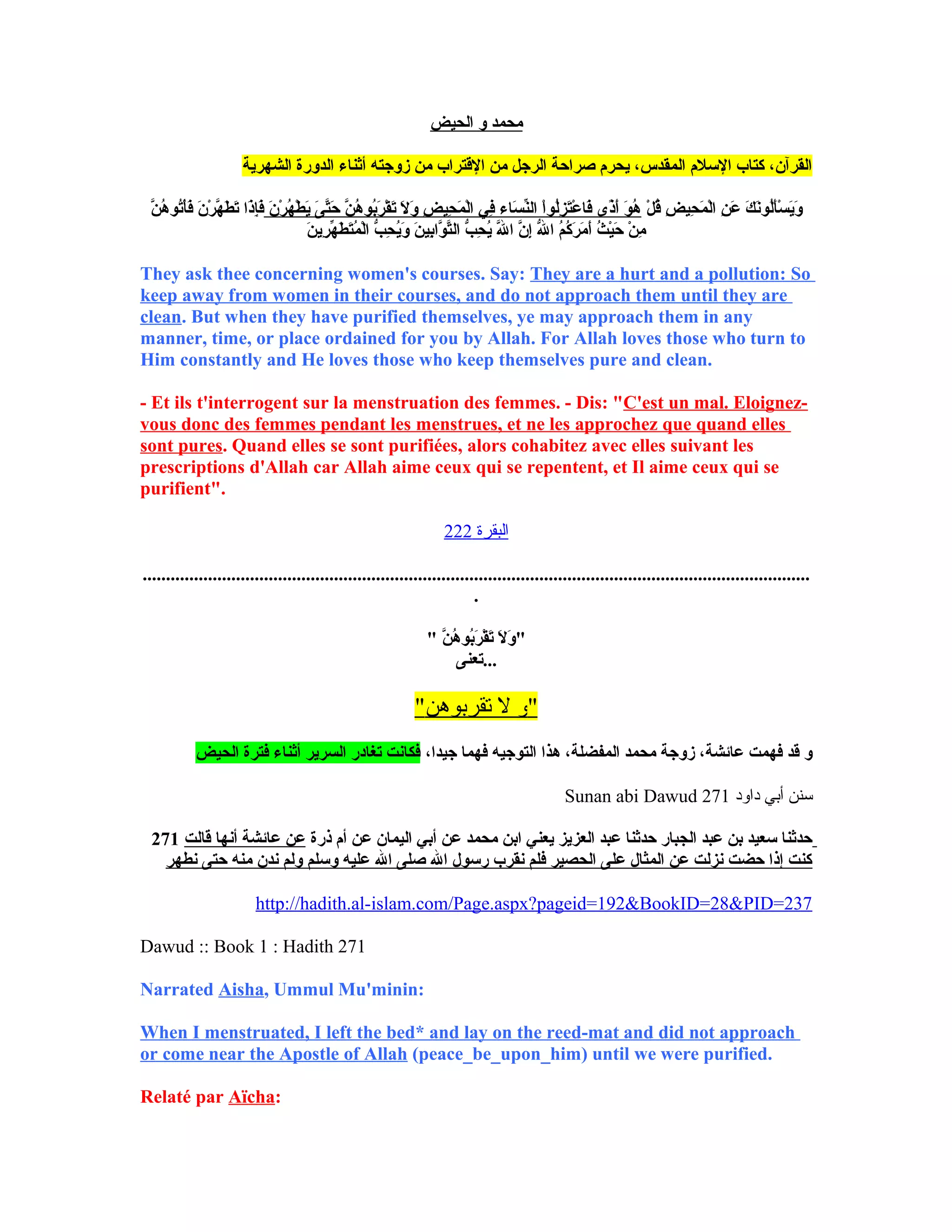 تناقش الوثيقة أحكام الدين الإسلامي المتعلقة بالحيض، مشيرة إلى أن ممارسة الجنس أثناء هذه الفترة محرمة، وينبغي الابتعاد عن النساء حتى تطهر. كما تحتوي الوثيقة على أحاديث نبوية تتعلق بالعلاقة بين الزوجين خلال فترة الطمث وكيفية التعامل معها وفق تعاليم الإسلام.