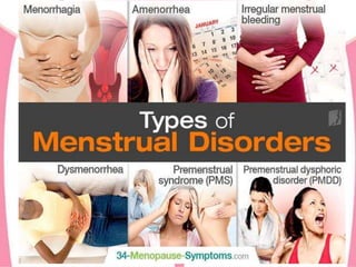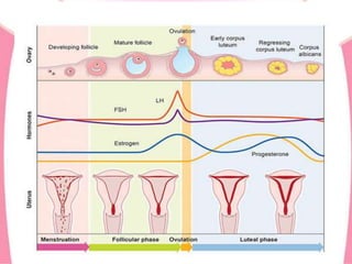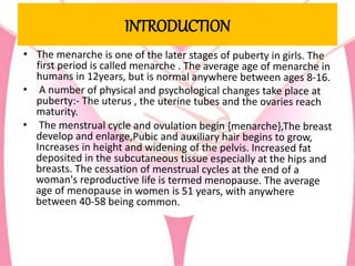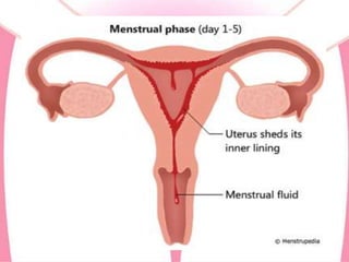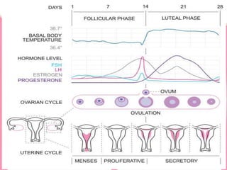 The document provides an overview of the menstrual cycle, detailing its definition, phases, and associated hormonal changes. It outlines the average cycle length, duration, and blood loss, along with descriptions of each phase: menstrual, proliferative, ovulation, and luteal. Additionally, it discusses conditions like amenorrhea, dysmenorrhea, and menorrhagia that can affect menstrual health.