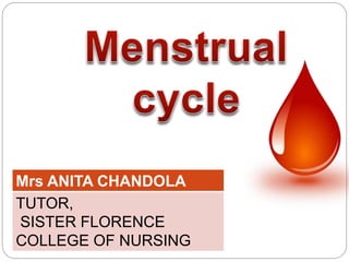 This document summarizes the female menstrual cycle. It describes that the menstrual cycle occurs over 28 days in the female reproductive system. It involves changes in the ovaries and uterus. In the ovaries, a follicle develops and then ruptures to release an egg (ovulation). If the egg is fertilized, the corpus luteum forms and secretes hormones to support pregnancy. If not fertilized, the corpus luteum breaks down, hormones decrease, and the uterine lining sheds through menstruation. The cycle then begins again with follicle development. Menarche begins the cycles at puberty and menopause ends them in older age.