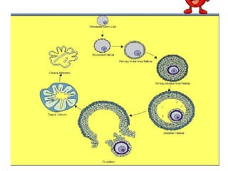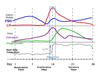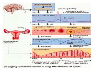 The menstrual cycle is regulated by fluctuating sex hormones from the pituitary gland. It consists of four phases: the follicular phase where follicles in the ovaries mature and estrogen levels rise, ovulation where a mature egg is released, the luteal phase where the corpus luteum produces progesterone, and menstruation where the uterine lining sheds if pregnancy does not occur. The cycle typically lasts around 28 days and involves changes in the ovaries and uterus governed by hormones that prepare the body for potential pregnancy each month.