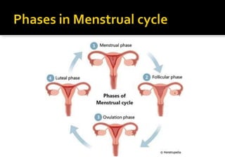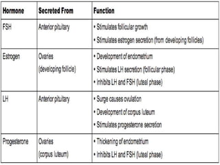The three main hormones involved in the female menstrual cycle are estrogen, progesterone, and luteinizing hormone (LH). Estrogen causes the thickening of the uterine lining and development of female secondary sex characteristics. Progesterone maintains the thickened uterine lining to prepare for potential implantation. If implantation does not occur, decreasing progesterone levels cause the uterine lining to shed through menstruation. LH surges near ovulation to trigger the release of a mature egg. Together, these hormones regulate the monthly changes in a woman's reproductive system through menarche, menstruation, and menopause.