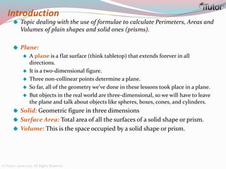 This document is a comprehensive guide to geometry, focusing on the calculations of perimeters, areas, and volumes of various shapes, both two-dimensional and three-dimensional. It explains key concepts such as planes, surfaces, and different geometric shapes, providing formulas and examples for calculating areas and volumes of rectangles, triangles, trapeziums, boxes, prisms, cylinders, pyramids, and cones. The document emphasizes the importance of understanding both surface area and volume in the context of solid geometry.