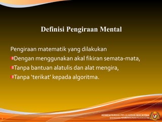 Dokumen ini membahas pengiraan mental dalam matematik yang dilakukan tanpa alat. Pengiraan mental membantu murid memahami perkaitan nombor, nilai tempat, dan meningkatkan keyakinan dalam matematik. Terdapat pelbagai strategi dalam pengiraan mental seperti menyusun semula nombor dan penggunaan gandaan untuk memudahkan penambahan dan penolakan.