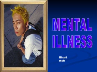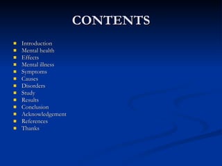 This document discusses mental health and illness. It defines mental health and lists some of its effects. Mental illness is caused by abnormal brain functioning and can cause thinking, emotional, and sleep problems. Common mental disorders mentioned include depression, schizophrenia, bipolar disorder, and anxiety disorders. The document also summarizes a study conducted on mental health status of university students in India which found high rates of mood changes, anger, and substance abuse among hostel residents. It concludes by emphasizing that those with mental illness should have their rights and contributions to society respected.