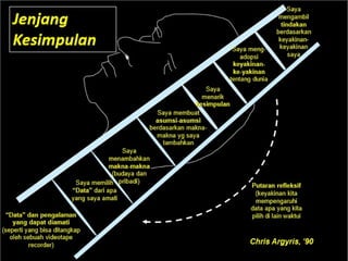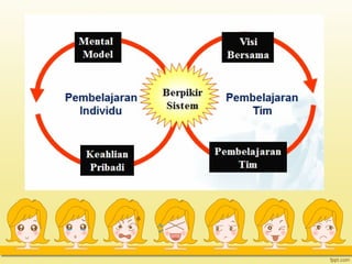 Dokumen ini menjelaskan tentang mental model dalam konteks organisasi pembelajar, termasuk definisi, manfaat, dan pentingnya diskusi serta revisi mental model. Terdapat penjelasan mengenai bagaimana mental model mempengaruhi pengambilan keputusan dan proses pembelajaran individu serta tim. Beberapa teknik untuk memperbaiki mental model seperti sadari pengaruhnya, ladder of inference, dan balancing inquiry and advocacy juga disoroti.