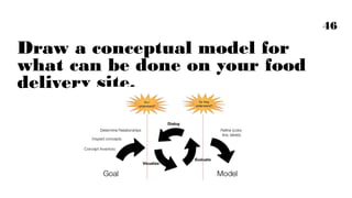 This document discusses mental models and conceptual models. It provides exercises for students to draw maps of grocery stores based on their mental models. Students then compare different grocery store websites and evaluate if they support common tasks. The document emphasizes using conceptual models to communicate ideas both within teams and to customers. Examples of conceptual models from other domains are provided, and students are asked to draw a conceptual model of a food delivery website. The goal is for students to learn how to create mental and conceptual models to help design products and services.
