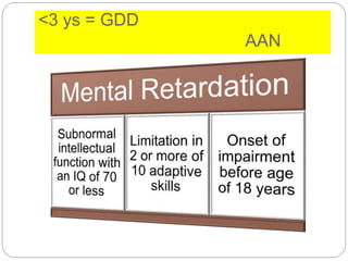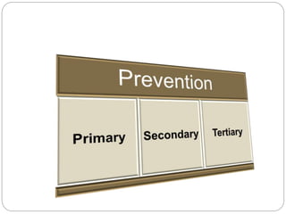 Primary prevention methods can help reduce the occurrence of mental retardation from certain conditions. Early screening through newborn screening can help detect treatable causes like phenylketonuria (PKU), galactosemia, and congenital hypothyroidism to prevent or reduce intellectual disability. Maintaining treatment protocols through dietary or medical management in PKU, galactosemia, maternal PKU, and congenital hypothyroidism is important for tertiary prevention. Genetic counseling can aid primary prevention for conditions with a genetic basis like Down syndrome, galactosemia, and PKU.