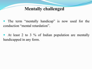 The document discusses the classification, causes, and management of mental retardation, now referred to as mental handicap, affecting approximately 2 to 3% of the Indian population. It categorizes mental retardation into mild, moderate, severe, and profound, each with varying IQ levels and capabilities for independence. It emphasizes the importance of early diagnosis, familial support, appropriate educational interventions, and therapeutic measures to enhance the overall development and independence of affected individuals.