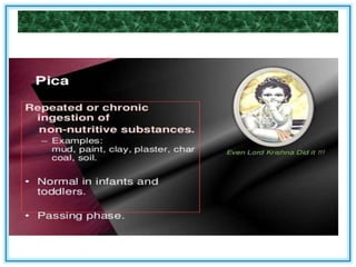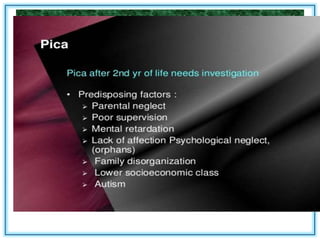 This document defines mental retardation and provides details about its epidemiology, diagnostic criteria, causes, clinical features, investigations, management, prevention, and recommendations for parents of children with mental retardation. Mental retardation involves deficits in intellectual and adaptive functioning that emerge before age 18. It can be mild, moderate, severe or profound depending on IQ level. Common causes include genetic disorders, developmental abnormalities, prenatal and postnatal factors. Management involves early diagnosis, developmental screening, intelligence and adaptive functioning tests, multidisciplinary care, and treating associated conditions. Some cases can be prevented or limitations reduced through early intervention.