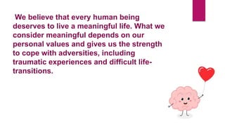 The document discusses mental status assessment. It defines mental status as a person's emotional and cognitive functioning, which allows them to function socially and occupationally. A traumatic life event can tip the balance of mental status and cause transient dysfunction. Assessing mental status during traumatic events can identify strengths and help individuals mobilize coping skills. Optimal functioning aims for life satisfaction in relationships, work, and within oneself. The document also discusses factors that can affect the interpretation of mental status examinations, such as medical conditions or medications. It provides details on components assessed in a mental status exam including appearance, behavior, mood, affect, orientation, and cognitive functions.