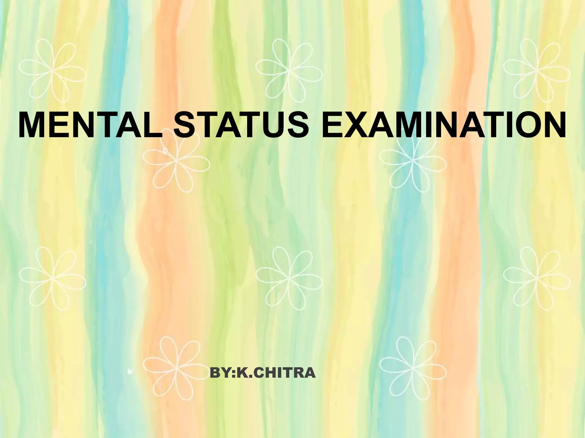 Mental Status Examination (MSE) is a standardized evaluation of a psychiatric patient's behavior, emotions, and cognitive functions. It involves interviewing the patient and relatives, taking a history, and conducting a physical exam and investigations. The MSE assesses elements like psychomotor activity, speech, mood and affect, thought content and form, perception, cognitive functions, insight, sleep patterns, and orientation. The examiner makes detailed notes of their observations to understand the patient's symptoms and make a clinical diagnosis.