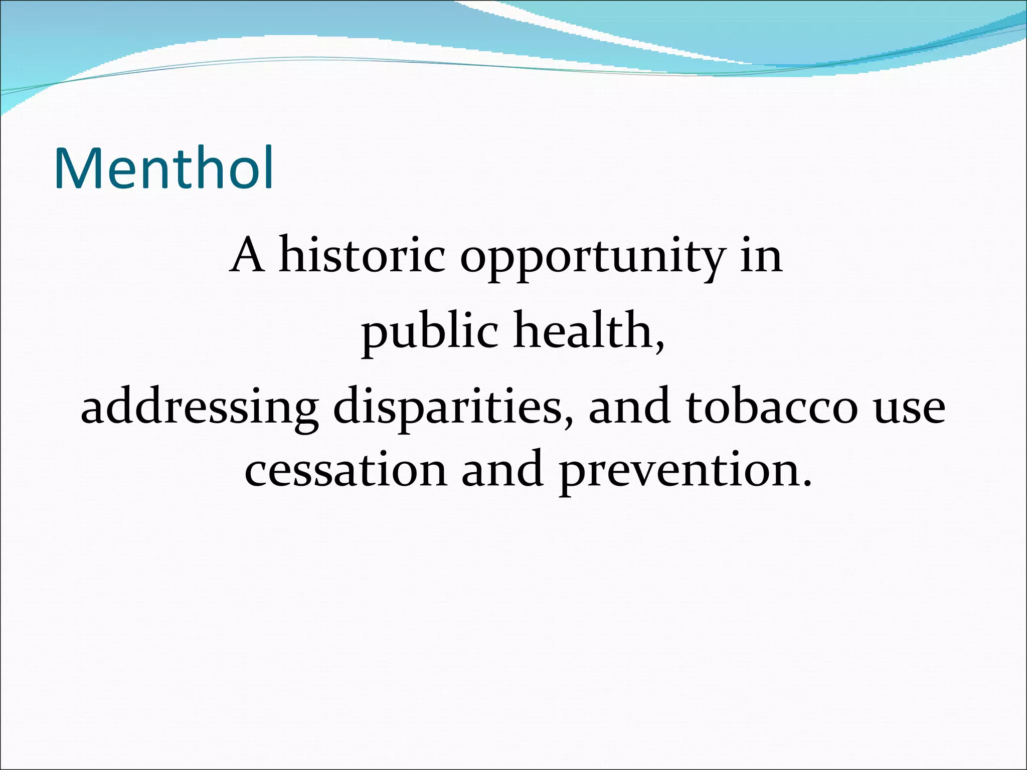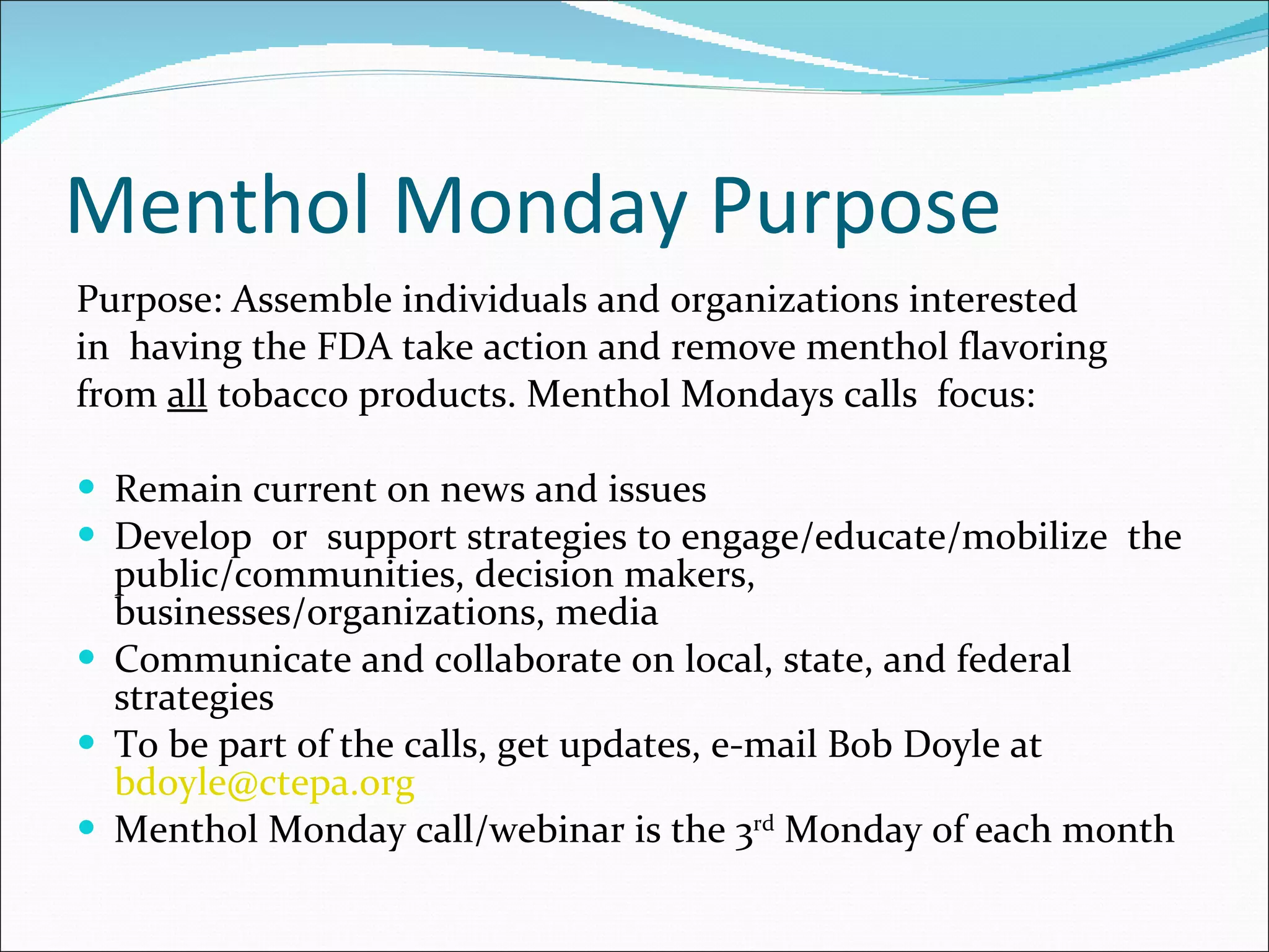 The document discusses menthol cigarettes and calls for the FDA to remove menthol flavoring from all tobacco products. It provides background on menthol cigarette use, the tobacco industry's targeting of certain groups, and strategies being used to oppose a menthol ban. Recent news and studies suggest removing menthol could significantly reduce smoking rates and tobacco-related deaths over time, especially among African Americans. The next steps mentioned are the upcoming FDA report and TPSAC meeting to further consider the issues.