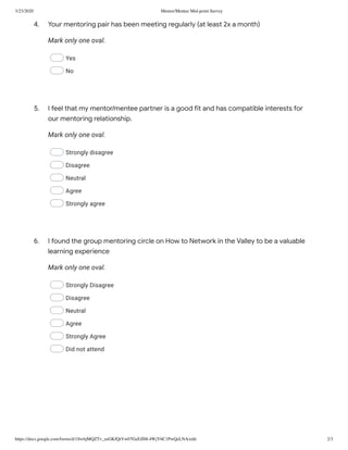 This document is a mid-point survey for mentors and mentees in the Tile Mentorship Program. It asks participants to rate statements about their experience on a scale and provide feedback to improve the program. The survey includes questions about why they joined the program, whether the training prepared them, if their pairing is a good fit, and if they found past events valuable. It concludes by asking if they would participate again and how the program could be improved.