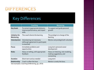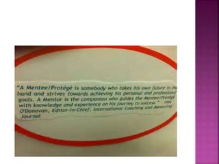 Mentoring is defined as a professional relationship where an experienced person assists another in developing skills and knowledge to enhance their professional and personal growth. It is a relationship that changes over time as both people grow and learn. A mentor teaches mentees specific issues, coaches skills, facilitates growth through sharing resources and challenges them outside their comfort zone in a safe learning environment focused on total development. Effective mentors are approachable, share information openly, have good communication skills, are trustworthy, and provide appropriate feedback and expertise while being motivating and sensitive to mentee needs.