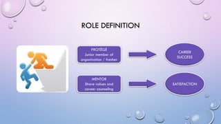 The document discusses mentoring, coaching, and their benefits. It states that mentoring is a beneficial career development tool where an experienced person assists and guides a junior employee. Having a mentor increases success, career satisfaction, and likelihood of staying with an organization. Coaching is an informal management approach used to develop skills and improve employee performance. The GROW model is presented as a framework for coaching conversations, focusing on goals, current reality, options, and developing a plan of action. Creating a coaching culture involves having regular coaching conversations to build relationships and focus on strengths.