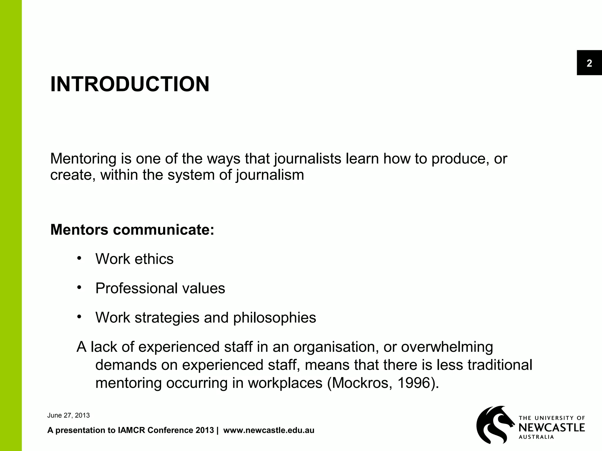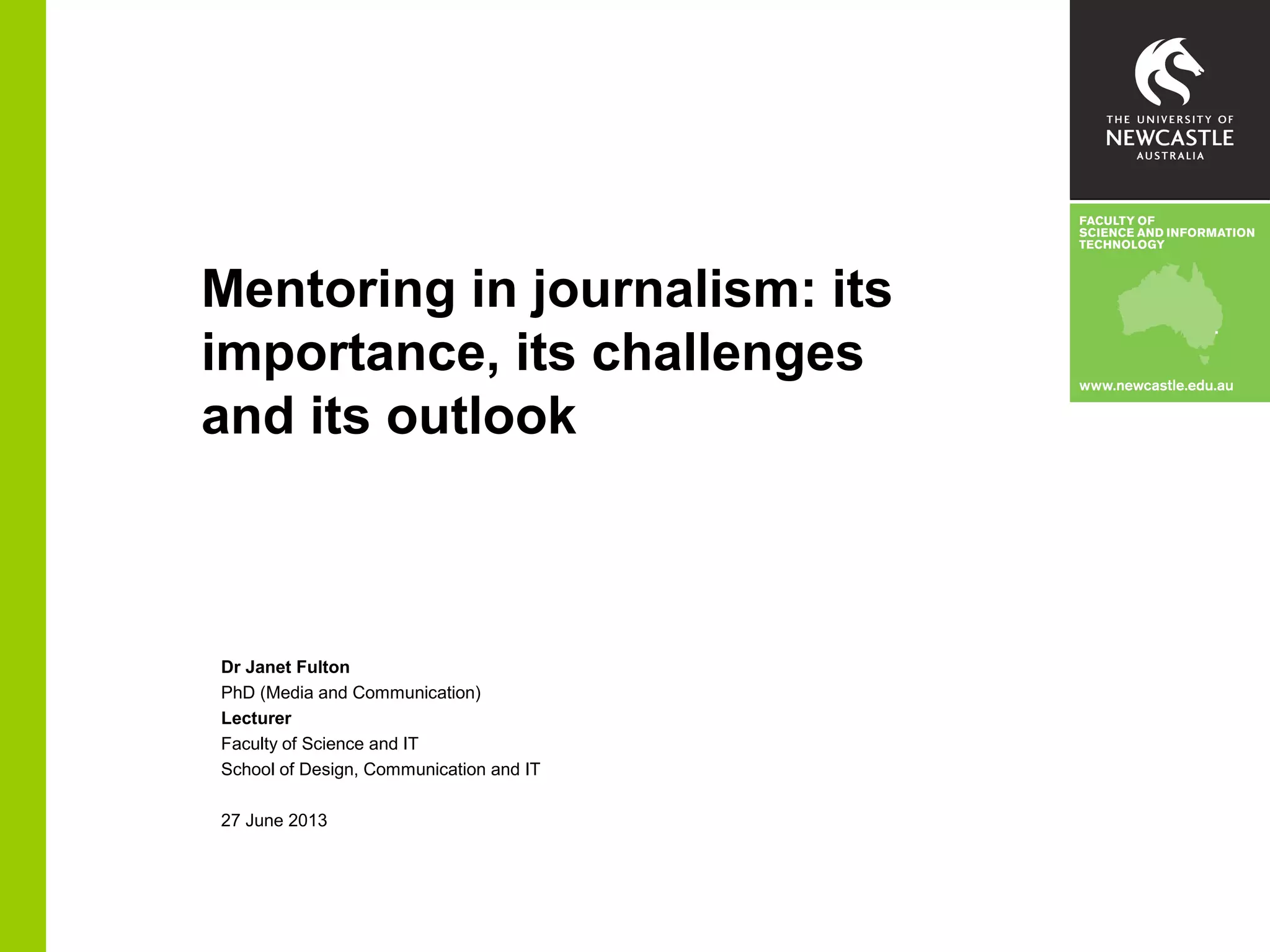 This document discusses mentoring in journalism, its importance, challenges, and outlook. It notes that mentoring is an important way journalists learn, but that job losses in media have reduced opportunities for traditional mentoring. The document presents research on mentoring based on interviews with 36 journalists and editors. It found that respondents overwhelmingly had mentors who helped them learn domain knowledge and navigate their field. However, with fewer experienced journalists, mentoring may need to occur outside the workplace. The conclusion states that while journalism jobs are decreasing, journalism itself is not dying, just changing platforms, so mentoring will still be important in the new environment.