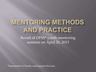 The document summarizes key points from a seminar on youth mentoring programs. It discusses the importance of mutual trust and empathy between mentors and mentees. A successful ratio of effort is recommended at 60-40 or 70-30 mentor to mentee. Program design, management, operations and evaluation are also outlined as important components. Best practices like screening mentors, training, and ongoing support are highlighted.