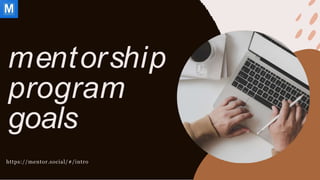 The document outlines the goals of mentorship programs, emphasizing their role in fostering personal and professional growth through structured relationships between mentors and mentees. Key objectives include knowledge transfer, skill development, and career advancement, which ultimately lead to benefits such as increased confidence and community building. Well-defined mentorship goals also enhance engagement and motivation for both participants and organizations.
